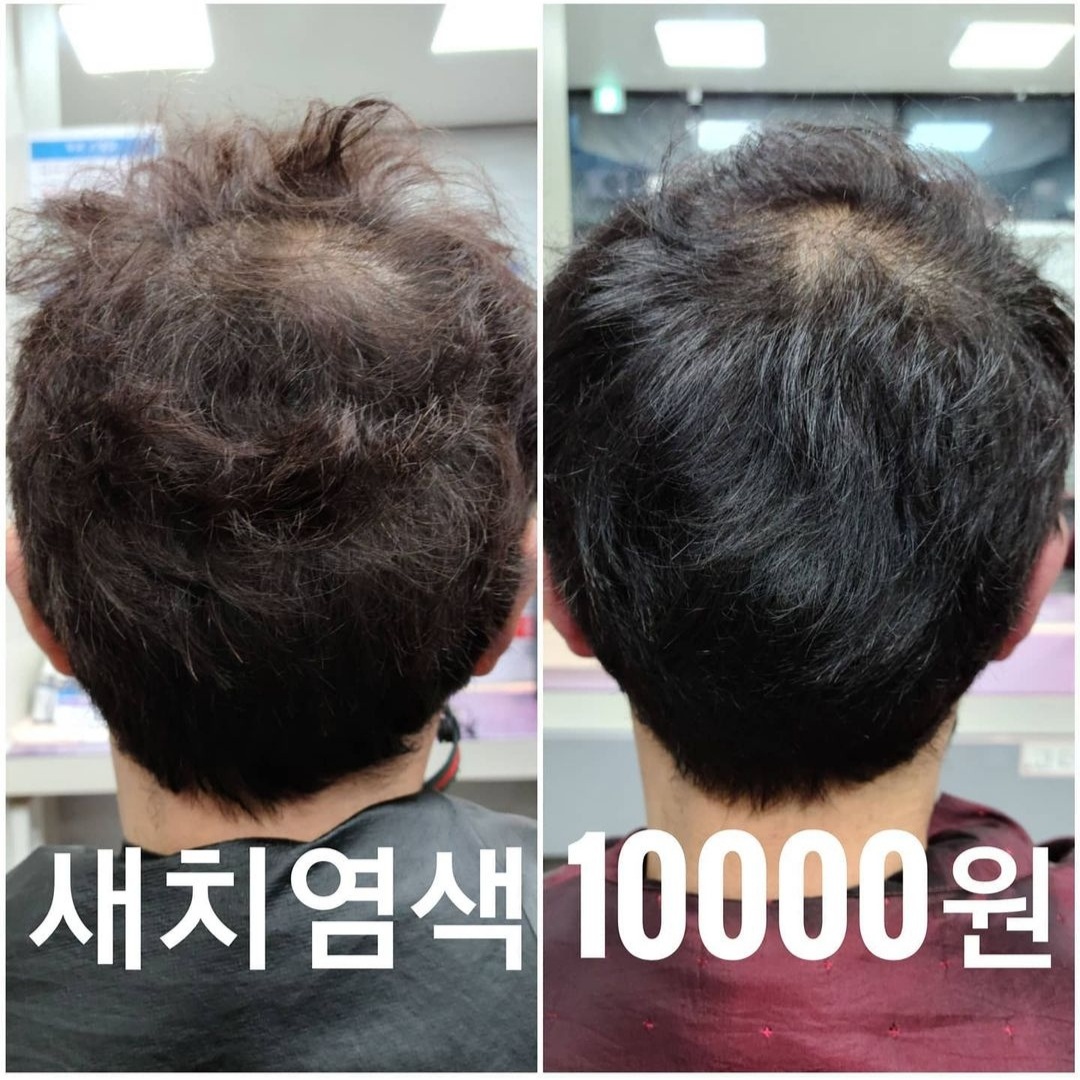 사진에 소개된 고객님의 머리길이 정도라면 10000원으로 블랙염색 새치염색